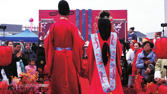 隨后,室外草坪婚禮開始,古代接親抬花轎、舞獅表演、新人婚紗走秀等輪番上演,現(xiàn)場變成歡樂的海洋。尤其是明制婚典儀式,讓圍觀人群一邊拿著手機(jī)拍照,一邊感嘆:“這種婚禮好有儀式感,太浪漫了。”