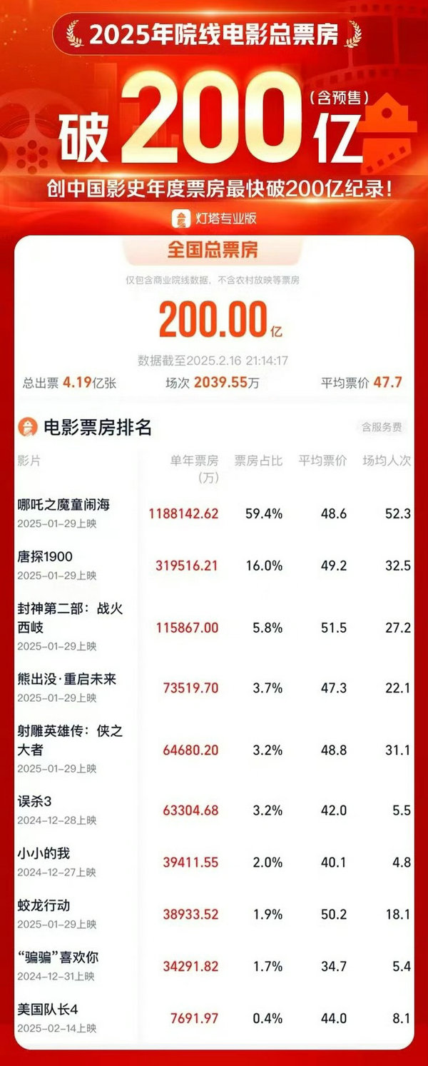 據(jù)網(wǎng)絡(luò)平臺數(shù)據(jù),截至2月16日21時14分,2025年度大盤票房(含預(yù)售)突破200億,刷新中國影史年度票房最快破200億紀錄,《哪吒之魔童鬧海》領(lǐng)跑。