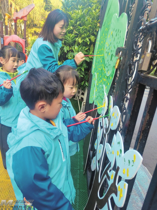 川幼春暉普明路幼兒園的孩子們用畫筆“點(diǎn)春”。(記者 彭雪 攝)