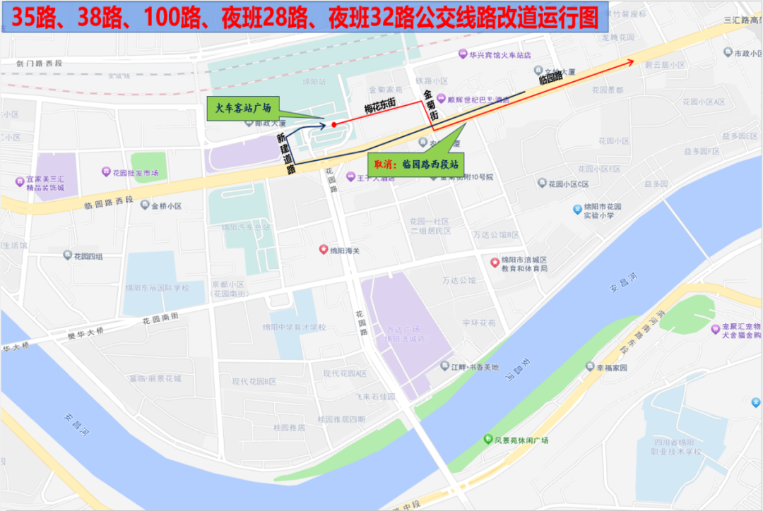 35路:火車客站廣場—沈家壩開元醫(yī)院。由火車客站廣場始發(fā),改道經(jīng)梅花東街、金菊街至臨園路回原線路運(yùn)行;開往火車客站廣場方向運(yùn)行路線不變。