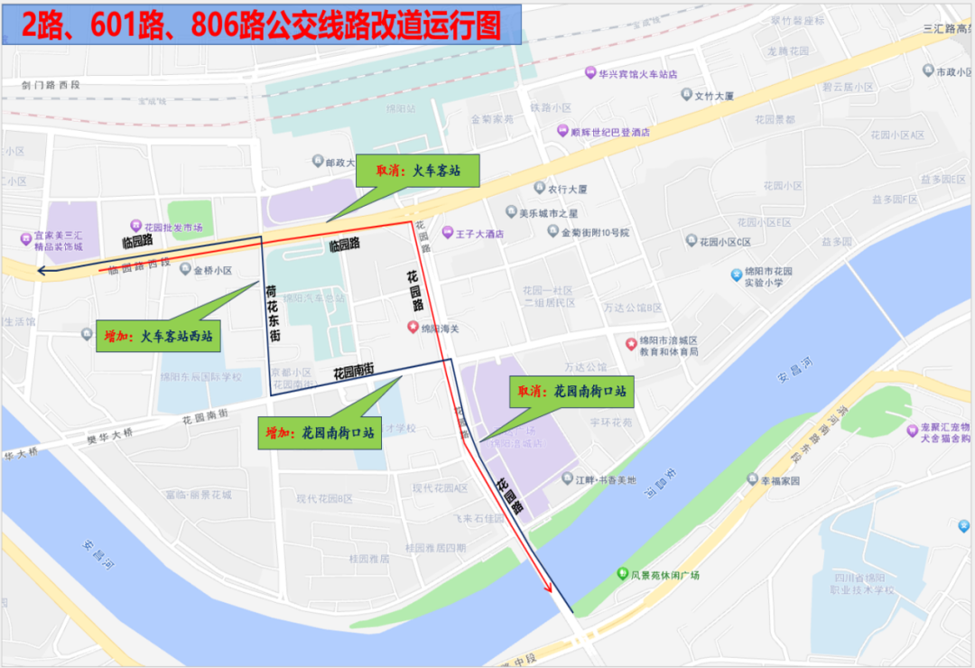 四川幼專—火車客站(改道后)。由四川幼專始發(fā),行至臨園路??炕▓@市場(愛爾眼科醫(yī)院)站后,改道經(jīng)臨園路,??炕疖嚳驼?汽車總站側(cè));返回經(jīng)花園路、花園南街、荷花東街至臨園路回原線路運(yùn)行。
