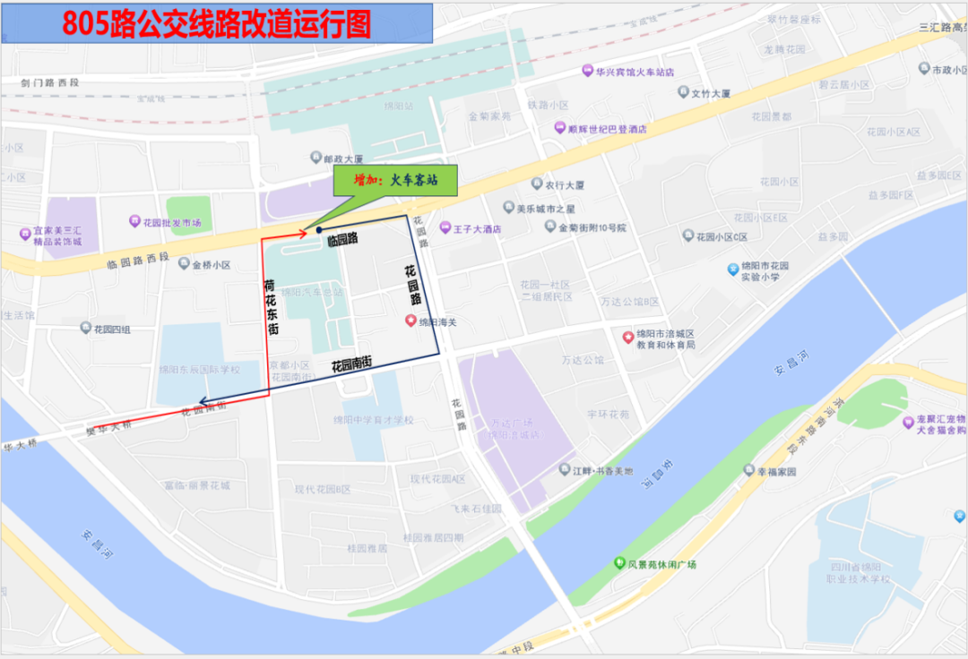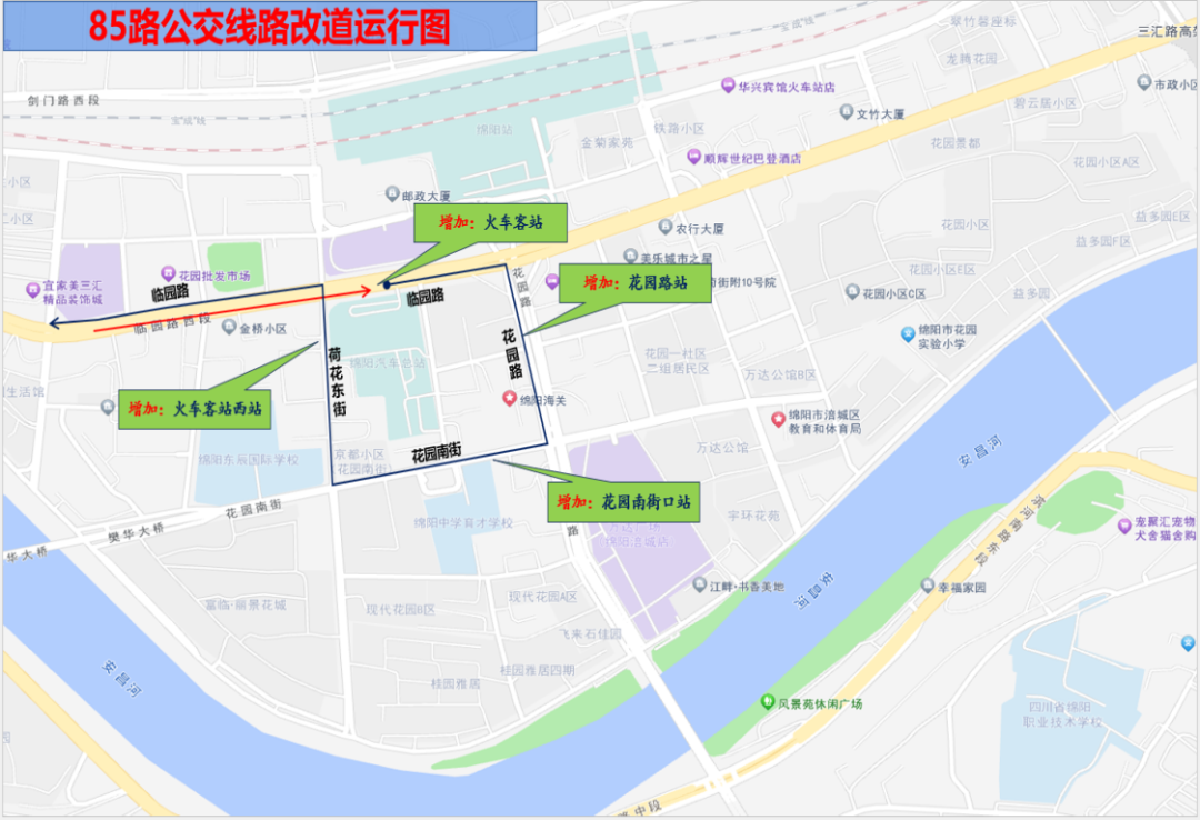 長虹智能產(chǎn)業(yè)園—火車客站(改道后)。開往火車客站方向,行至荷花東街??炕疖嚳驼疚髡竞螅牡澜?jīng)臨園路至火車客站(汽車總站側(cè));返回經(jīng)花園路至花園南街回原線路運(yùn)行。