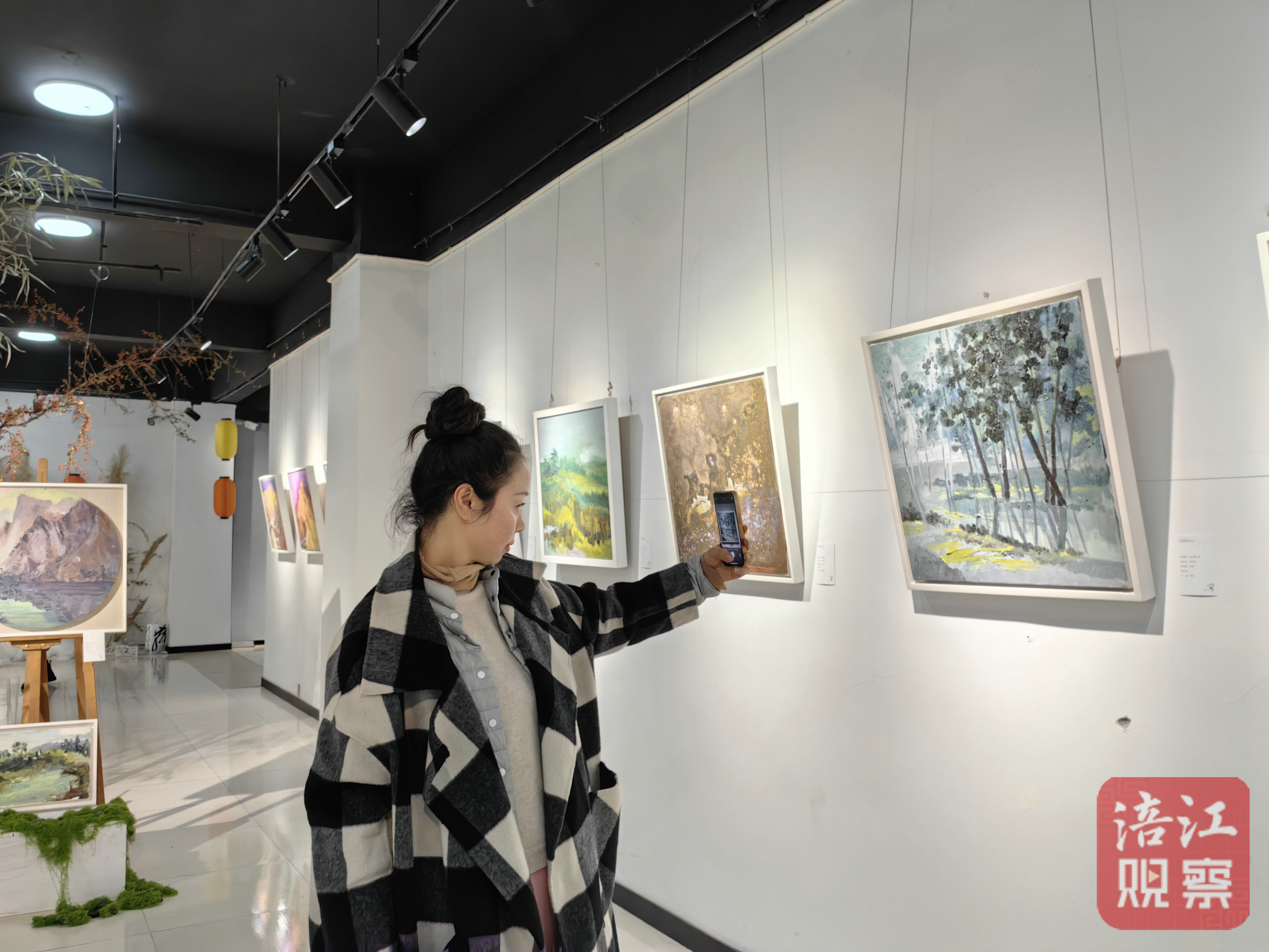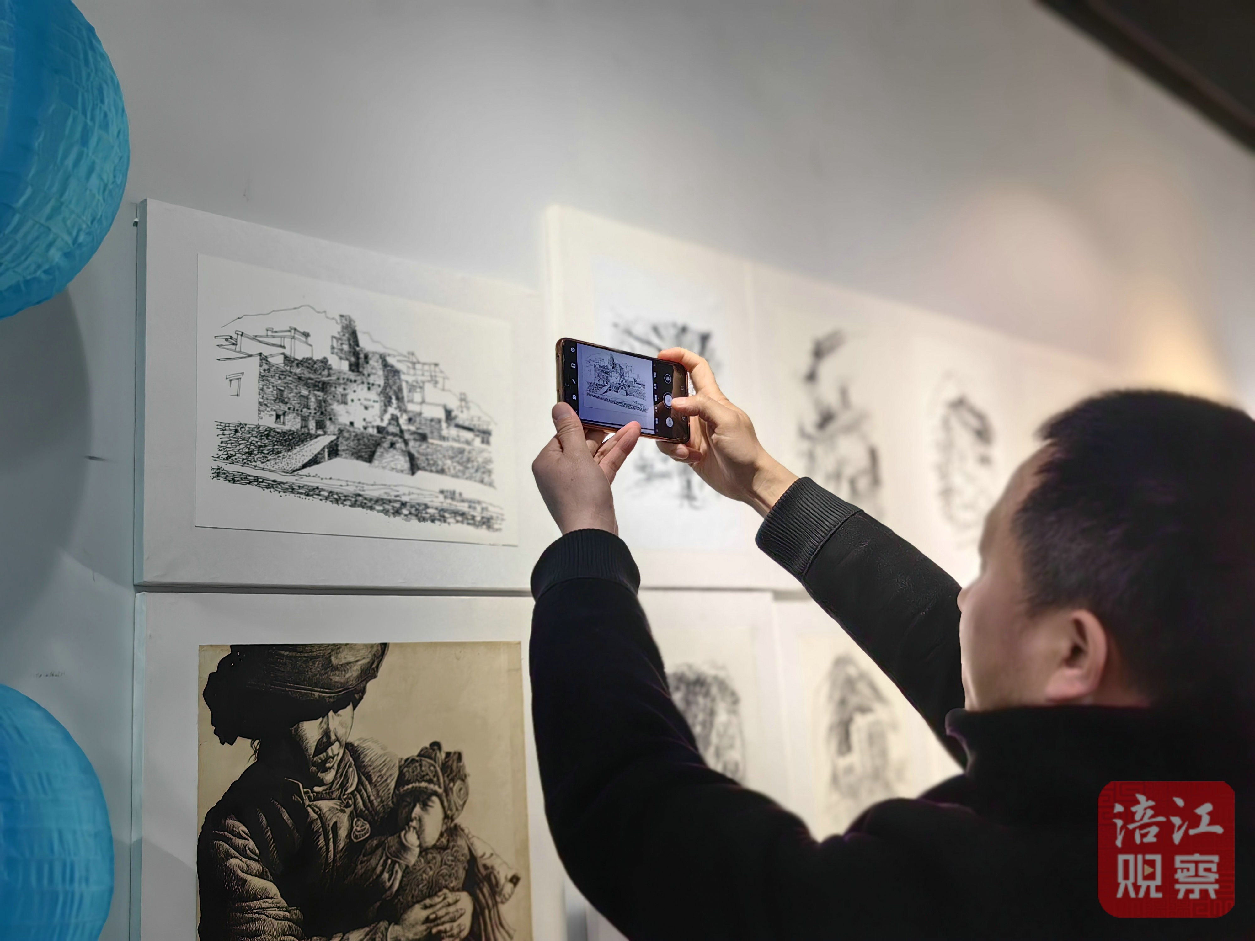 在展覽現(xiàn)場,不少參觀者一邊欣賞一邊拿出手機拍攝,有的對展出作品所呈現(xiàn)的內(nèi)容、蘊含的藝術(shù)價值、人文情懷進行探討。