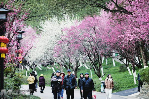 西山公園也是一片熱鬧景象。千余株種類多樣的梅花陸續(xù)綻放,淺粉、玫紅、雪白的花朵成片分布在山間,如煙似霞。不少市民游客慕名而來,打卡拍照,記錄下這美好的春日瞬間。西山公園的梅花花期從2月初開始,將持續(xù)一個月左右。