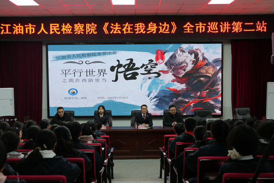講座中,江油市第五檢察部副主任唐帆化身說(shuō)書人以大家耳熟能詳?shù)摹段饔斡洝分袑O悟空的經(jīng)歷為主線,巧妙地融入了校園欺凌、禁毒和預(yù)防網(wǎng)絡(luò)性侵害三個(gè)重要主題,讓法治知識(shí)如同一股清泉,緩緩流入同學(xué)們的心田。