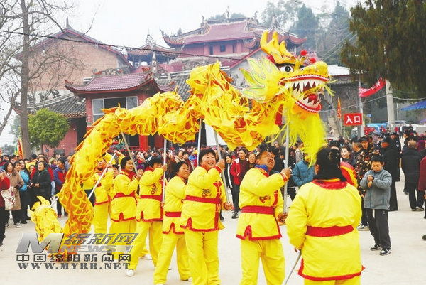 “涪江河畔龍頭山,二月初二展龍顏,祈求蛇年風(fēng)雨順,五谷豐登萬民歡。請(qǐng)龍!”隨著“龍頭節(jié)”請(qǐng)龍司儀雷啟兵一聲高亢有力的呼喊聲,4名身著傳統(tǒng)服飾的強(qiáng)壯男子齊心協(xié)力將金色龍頭抬起,從龍頭山腳下出發(fā),穿越小鎮(zhèn)街巷進(jìn)行巡游;舞龍、耍獅子、劃采蓮船、踩高蹺……各種民俗表演緊隨其后,簇?fù)碇堫^緩緩前行,組成一支壯觀的巡游隊(duì)伍。