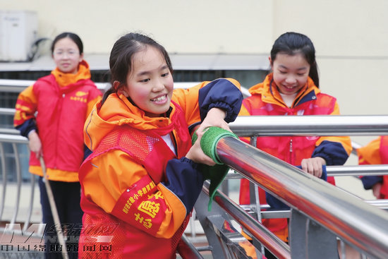3月5日,綿陽市實驗小學同學們在社區(qū)清理護欄、拾撿雜物。(記者 陳冬冬攝)