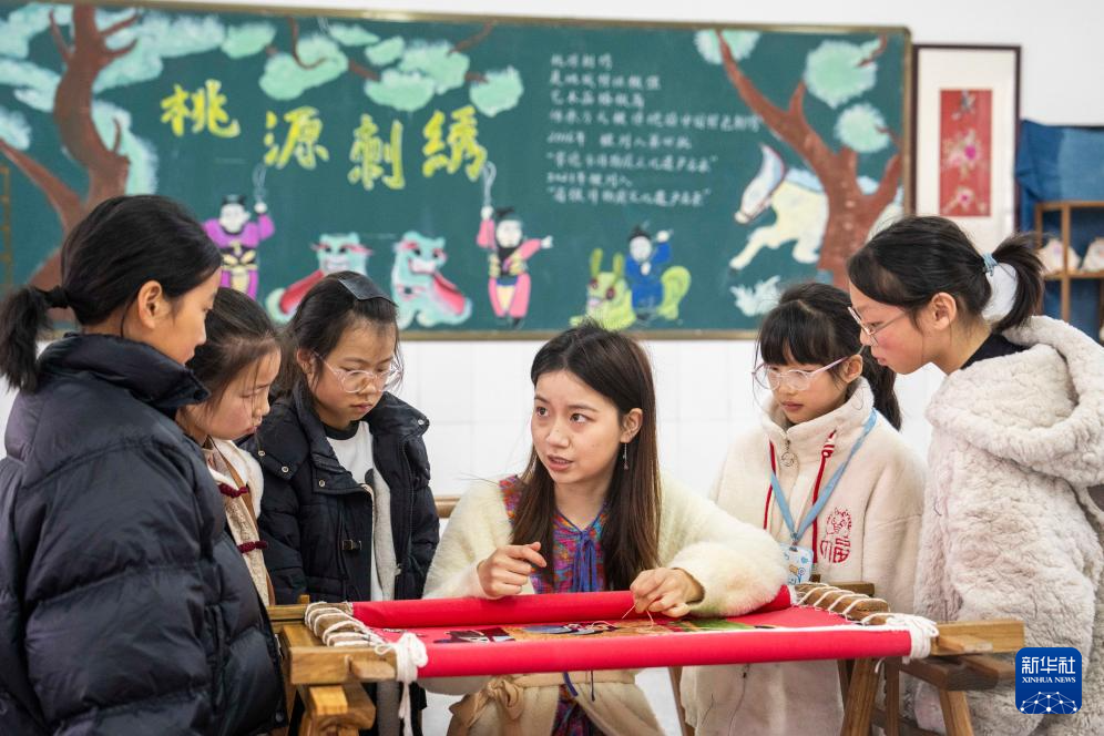 近年來(lái),湖南省常德市桃源縣充分利用地方文化資源,常態(tài)化開(kāi)展非遺進(jìn)校園活動(dòng),將當(dāng)?shù)胤沁z項(xiàng)目——桃源刺繡技藝引進(jìn)課堂,定期邀請(qǐng)非物質(zhì)文化遺產(chǎn)代表性傳承人走進(jìn)校園,進(jìn)行傳統(tǒng)文化授課,讓學(xué)生親身感受非物質(zhì)文化遺產(chǎn)的魅力,讓傳統(tǒng)文化薪火相傳。
