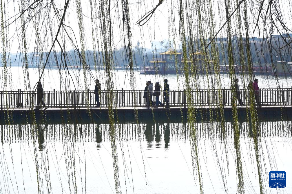 3月6日,游人在河南省開(kāi)封市龍亭西湖棧道上游覽。