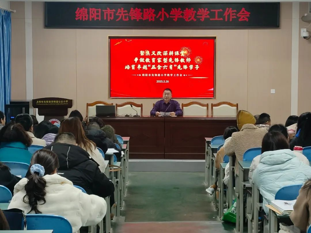 近日,綿陽市先鋒路小學全體教職工齊聚學術廳召開了以“深耕課堂提質量,落實常規(guī)促發(fā)展”為主題的2025年春季學期教學工作會,共謀學校高質量發(fā)展路徑。會議由牟芙穎老師主持,校領導及教師代表圍繞德育管理、教研創(chuàng)新、教學改革等核心議題展開部署與交流。