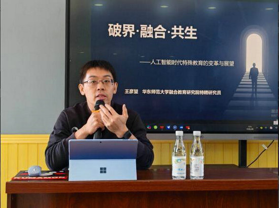 本次培訓(xùn)以“破界·融合·共生——人工智能對(duì)特殊教育的變革與展望”為主題。由華東師范大學(xué)融合教育研究院特聘研究員、七維教育平臺(tái)負(fù)責(zé)人王彥堃擔(dān)任主講。培訓(xùn)中,王彥堃教授憑借深厚的學(xué)術(shù)功底和豐富的實(shí)踐經(jīng)驗(yàn),為老師們深入剖析了人工智能技術(shù)在特殊教育領(lǐng)域的廣泛應(yīng)用及其帶來的深刻變革。他從智能輔助教學(xué)、個(gè)性化學(xué)習(xí)路徑規(guī)劃、情感識(shí)別與干預(yù)等多個(gè)方面,展示了人工智能技術(shù)在提升特殊教育質(zhì)量和效率方面的巨大潛力。同時(shí),王教授還展望了人工智能技術(shù)在特殊教育領(lǐng)域的未來發(fā)展趨勢(shì),提出了“破界·融合·共生”的教育理念,鼓勵(lì)老師們積極擁抱新技術(shù),實(shí)現(xiàn)教育資源的優(yōu)化配置和教育質(zhì)量的全面提升。