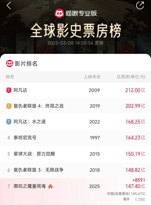 《哪吒2》票房已超147億元 圖據(jù)貓眼專業(yè)版