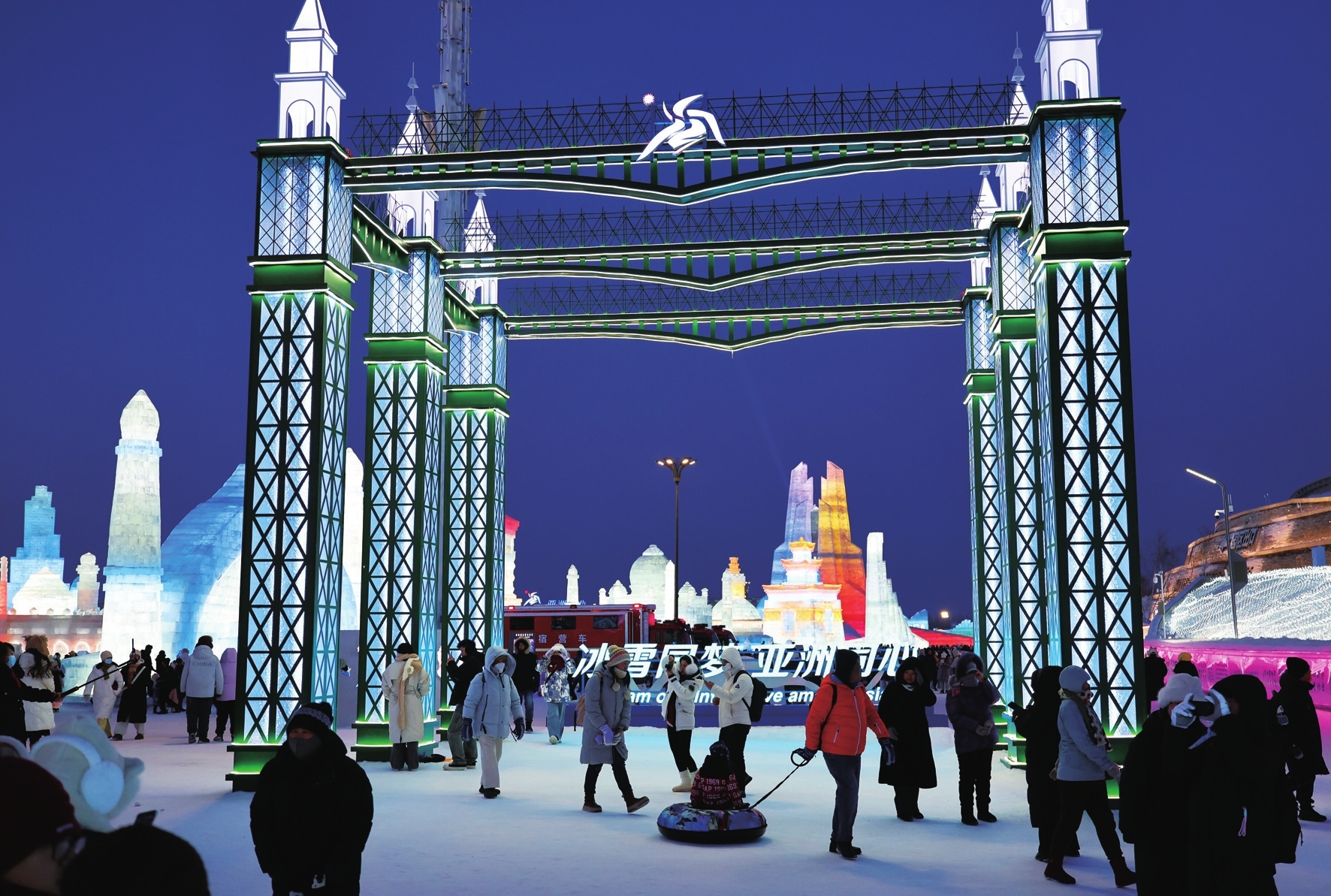 冰雪旅游熱門目的地黑龍江哈爾濱在第九屆亞冬會的帶動效應下,吸引了眾多國內外游客前來賞冰樂雪,感受冰雪之美。圖為2月9日,游客在哈爾濱冰雪大世界游覽。(新華社發(fā))