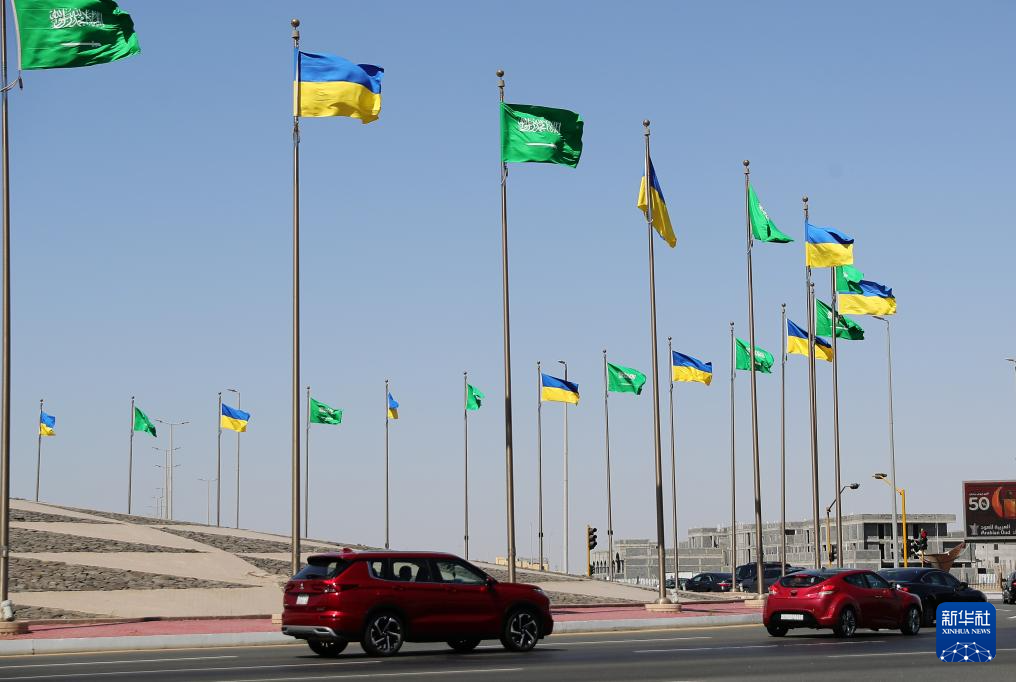 3月10日,在沙特阿拉伯吉達,沙特阿拉伯和烏克蘭兩國的國旗在道路旁飄揚。新華社記者 王東震 攝