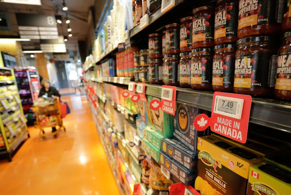 2025年2月25日,在加拿大溫哥華一家超市內(nèi),加拿大商品的旁邊貼著印有“加拿大制造”的標(biāo)簽。新華社發(fā)(梁森攝)