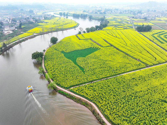 3月12日,游客乘坐游船在重慶潼南崇龕花海景區(qū)游覽(無(wú)人機(jī)照片)。