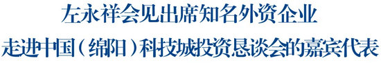 綿陽(yáng)新聞網(wǎng)訊 3月14日,知名外資企業(yè)走進(jìn)中國(guó)(綿陽(yáng))科技城投資懇談會(huì)期間,副省長(zhǎng)、市委書(shū)記左永祥會(huì)見(jiàn)出席活動(dòng)的嘉賓代表。
