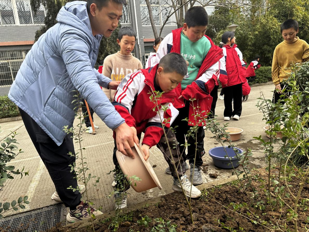 同學們在老師的指導下,在校園的空地挖坑、栽樹、澆水,親手種下一棵棵小樹苗,為校園增添了一抹新綠。