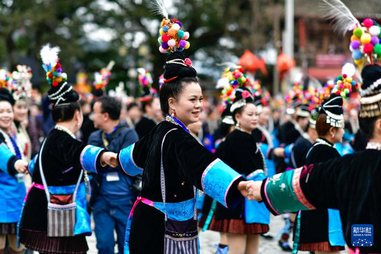 3月15日,當(dāng)?shù)厝罕娫谫F州省榕江縣三寶侗寨“薩瑪節(jié)”活動(dòng)中跳“多耶舞”。