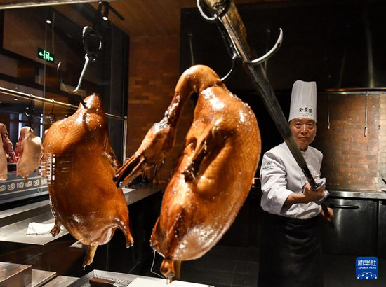 全聚德掛爐烤鴨第六代傳承人、高級烹飪技師吳玉波在出爐烤制好的掛爐烤鴨(3月13日攝)。