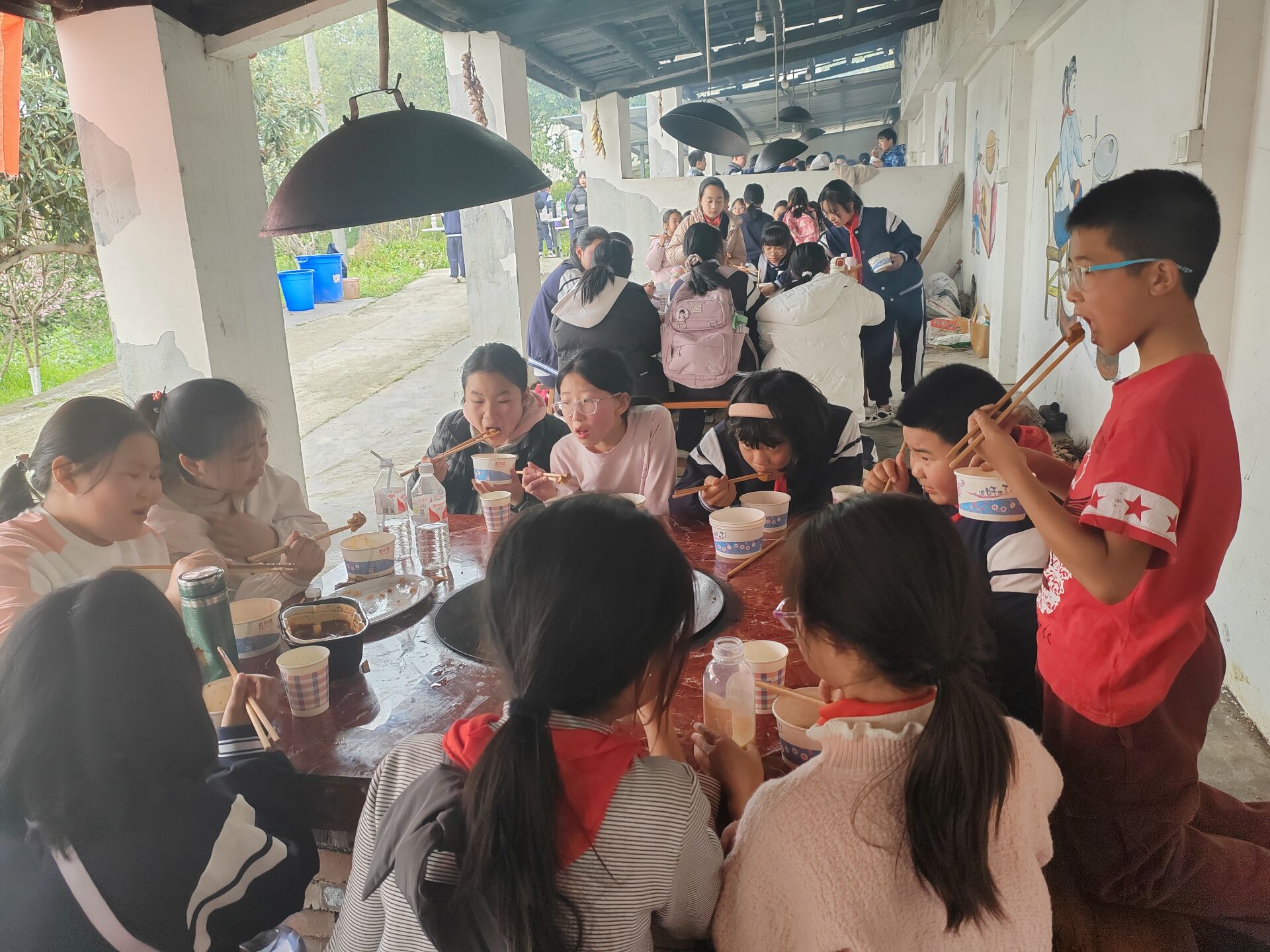 在勞動實踐基地體驗環(huán)節(jié),學生們?nèi)橥度?,參與了全自動氣象觀測、污水處理系統(tǒng)學習、種植區(qū)松土播種、養(yǎng)殖區(qū)基礎養(yǎng)護、陶藝創(chuàng)作體驗等活動。最火爆的是廚藝實踐區(qū),學生們在專業(yè)廚師指導下揉面制饃、掌勺顛鍋,金黃的玉米饃饃與熱氣騰騰的土豆燒雞香氣交織,勞動成果分享會秒變"美食評鑒現(xiàn)場"。