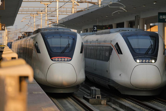 兩列城際列車在“四線貫通”后的佛莞城際官橋北站???。