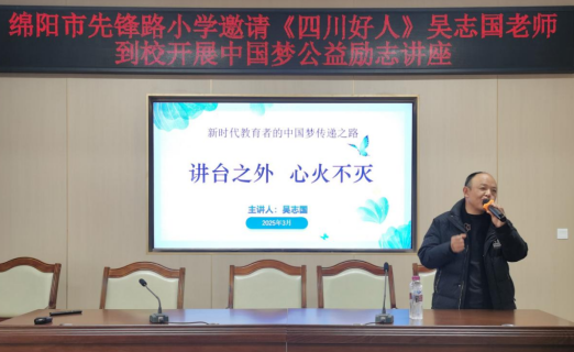 3月24日,春陽煦暖,綿陽市先鋒路小學(xué)在學(xué)術(shù)廳內(nèi)舉行了以“以生命微光點(diǎn)亮中國(guó)”為主題的2025年春“中國(guó)夢(mèng)”公益勵(lì)志講座活動(dòng)。主講人吳志國(guó)老師以自身與病痛抗?fàn)幍慕?jīng)歷,為4-6年級(jí)學(xué)生帶來了一場(chǎng)感人至深的演講,現(xiàn)場(chǎng)掌聲與淚水交織,師生共同接受了一次精神的洗禮。