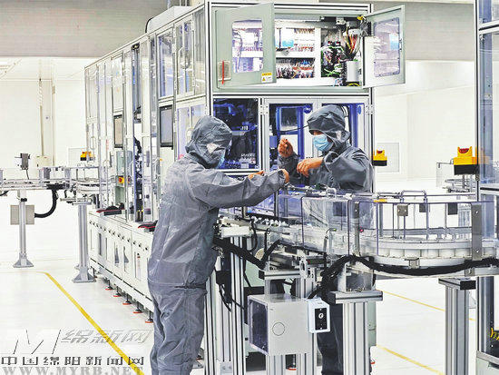 在綿陽創(chuàng)明智能電池有限責(zé)任公司鋰電池生產(chǎn)車間,工人正在調(diào)試電池產(chǎn)線。