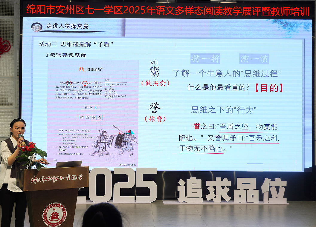 活動(dòng)中,8位教師圍繞統(tǒng)編教材創(chuàng)新閱讀教學(xué)實(shí)踐。劉佩青創(chuàng)設(shè)“時(shí)光博物館”,以雙文比讀解碼寫作技巧,用成長時(shí)間軸串連童年記憶,創(chuàng)新融合敘事支架與感恩教育,讓語文課化作生命對(duì)話場(chǎng)域。張維琴解構(gòu)《自相矛盾》,借“字詞尋寶”破解文言密碼,通過楚人角色模擬與邏輯漏洞辯論,架設(shè)古今思辨橋梁,引導(dǎo)學(xué)生在生活實(shí)踐中理性納諫。蘇碧蓉依托《田忌賽馬》設(shè)計(jì)分層任務(wù)鏈,從“對(duì)陣圖”策略推演到實(shí)戰(zhàn)寫作,以角色穿越激活歷史智慧,培育破局思維與創(chuàng)新表達(dá)力。王逸梅運(yùn)用思維導(dǎo)圖拆解寓言悖論,結(jié)合漫畫改編、廣告詞創(chuàng)作等創(chuàng)意作業(yè),讓文言智慧照進(jìn)現(xiàn)實(shí)矛盾分析。丁熙平聚焦《跳水》構(gòu)建“動(dòng)詞鏈”危機(jī)推演模型,通過水手笑因分析與船長決策模擬,鍛造學(xué)生應(yīng)急思辨力。張燕以情景遷移重構(gòu)楚人賣矛現(xiàn)場(chǎng),借“坦克矛盾”等生活案例延伸思辨觸角。郭彬彬設(shè)計(jì)“矛盾PK戰(zhàn)況表”培育古文偵探,續(xù)寫楚人新結(jié)局深化邏輯遷移。楊揚(yáng)緊扣《跳水》結(jié)局溯源,通過船長決策鏈還原與水手“笑”因深挖,在采訪模擬中淬煉冷靜思維,讓經(jīng)典煥發(fā)現(xiàn)代思辨光芒。