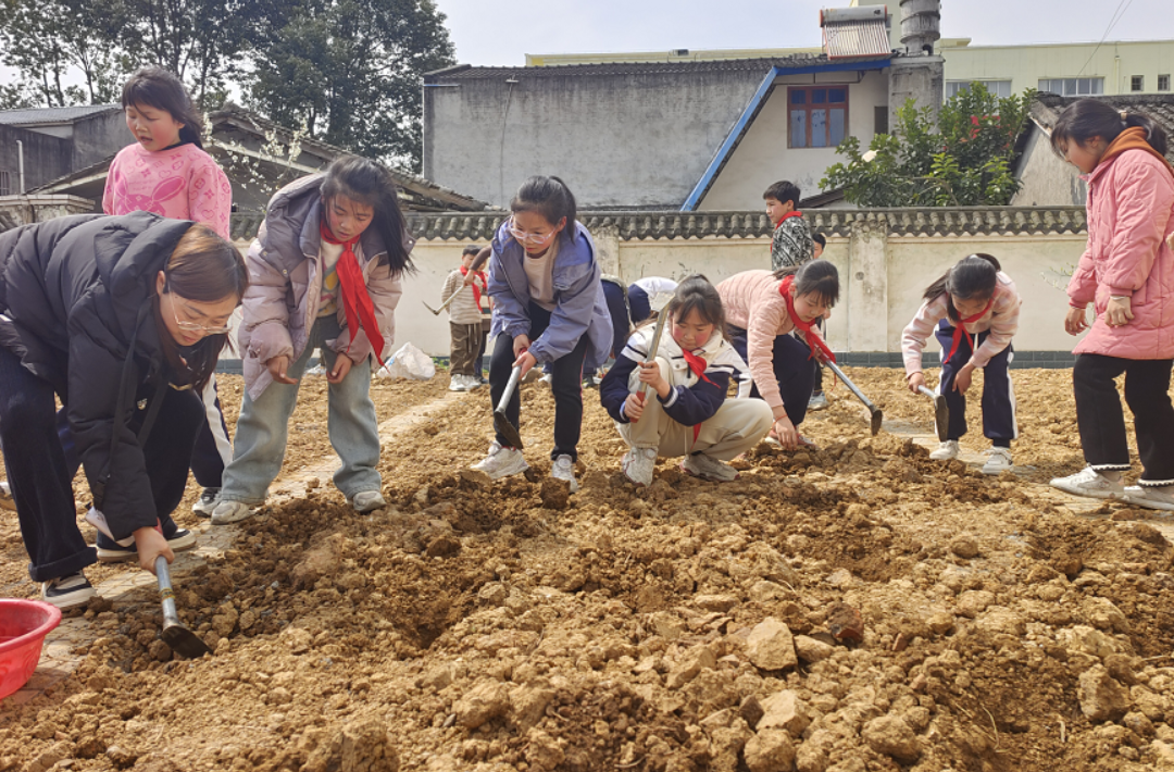 該校園內(nèi)的勞動(dòng)基地?zé)狒[非凡,四年級(jí)全體學(xué)生在老師的帶領(lǐng)下開(kāi)展辣椒苗種植活動(dòng),將勞動(dòng)教育與實(shí)踐深度融合,為校園增添一抹生機(jī)綠意。
