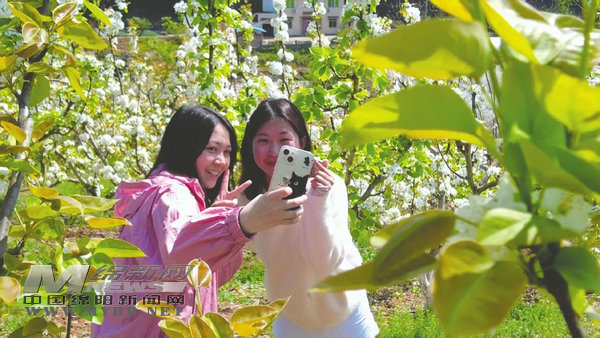 游客在梨花叢中打卡拍照