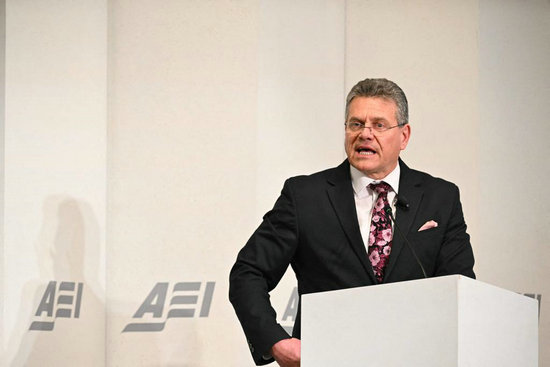 2月19日,歐盟委員會負責貿(mào)易和經(jīng)濟安全等事務的委員馬羅什·謝夫喬維奇在美國首都華盛頓發(fā)表講話。新華社/法新
