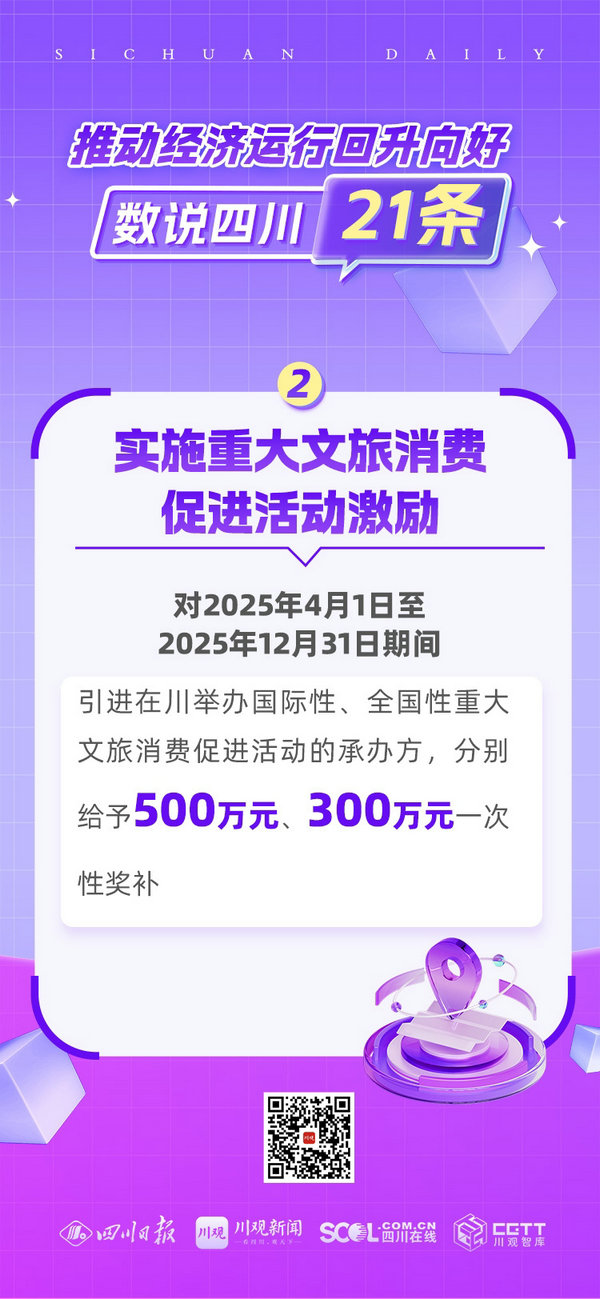對(duì)2025年4月1日至2025年12月31日期間,引進(jìn)在川舉辦國(guó)際性、全國(guó)性重大文旅消費(fèi)促進(jìn)活動(dòng)的承辦方,省級(jí)財(cái)政分別給予500萬元、300萬元一次性獎(jiǎng)補(bǔ)。