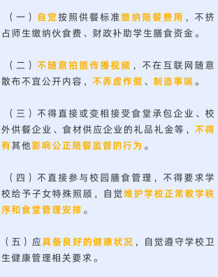 家長參與陪餐應(yīng)當(dāng)遵守學(xué)校有關(guān)紀(jì)律要求,確保實(shí)事求是、客觀公正,并履行如下義務(wù):