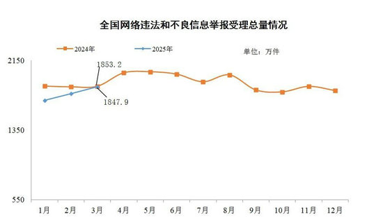 中央網(wǎng)信辦舉報中心4月10日公布的數(shù)據(jù)顯示,2025年3月,中央網(wǎng)信辦舉報中心指導全國各級網(wǎng)信舉報工作部門、主要網(wǎng)站平臺受理網(wǎng)民舉報色情、賭博、侵權(quán)、謠言等違法和不良信息1847.9萬件,環(huán)比增長4.5%、同比下降0.3%。