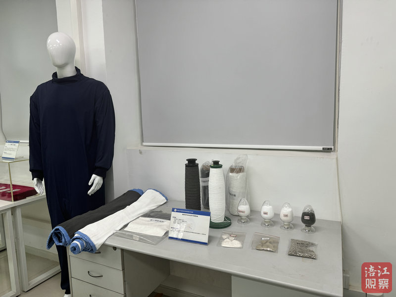 “我們突破了在高分子材料中輻射防護(hù)功能組元高填充的關(guān)鍵技術(shù)。”周元林教授指著成品介紹,從而形成的高填充纖維具有較好可紡性,制備出防輻射和穿戴舒適的纖維織物及其可穿戴制品。這也是目前國(guó)內(nèi)首套具有輻射防護(hù)功能,又具備透氣透濕性的特種功能輻射防護(hù)服。