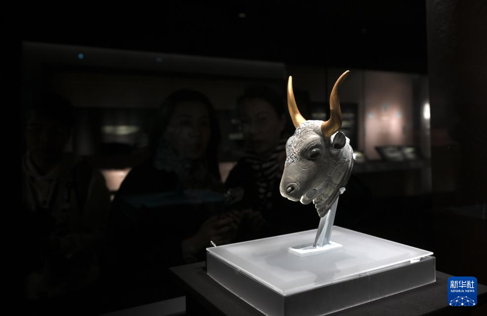 展出的公牛頭形綠泥石來通杯(4月14日攝)。