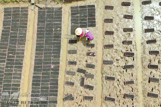 另一邊,經(jīng)過(guò)催芽后的一盤盤秧苗盤抵達(dá)位于黎雅鎮(zhèn)蘭花村的試驗(yàn)田,村民將標(biāo)準(zhǔn)化的秧苗盤放置在水田里,等著出3片葉子后,差不多半個(gè)月時(shí)間,就可以拿出來(lái)用插秧機(jī)插秧了。