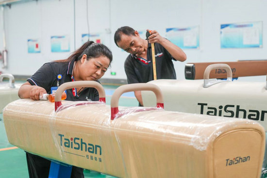 2024年7月8日,在山東泰山器材有限公司生產(chǎn)車間,工人在檢測剛下線的鞍馬。新華社記者 朱崢 攝