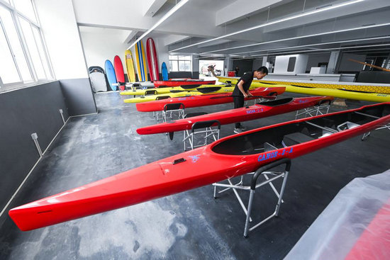 2023年7月18日,在位于杭州富陽的杭州飛鷹船艇有限公司車間內,工人在檢查一批剛完工的皮劃艇。新華社記者 徐昱 攝