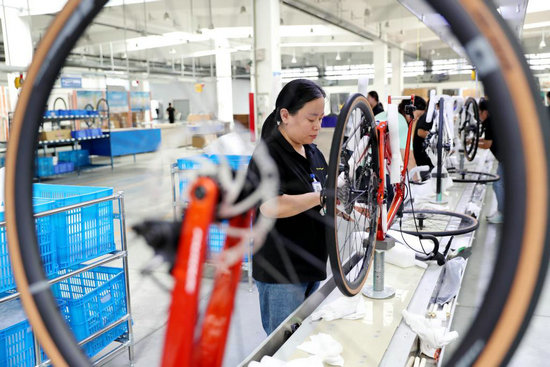 2023年9月9日,在山東樂陵市一家企業(yè)的碳纖維自行車生產(chǎn)車間,工人在組裝自行車。新華社發(fā)(張進剛攝)
