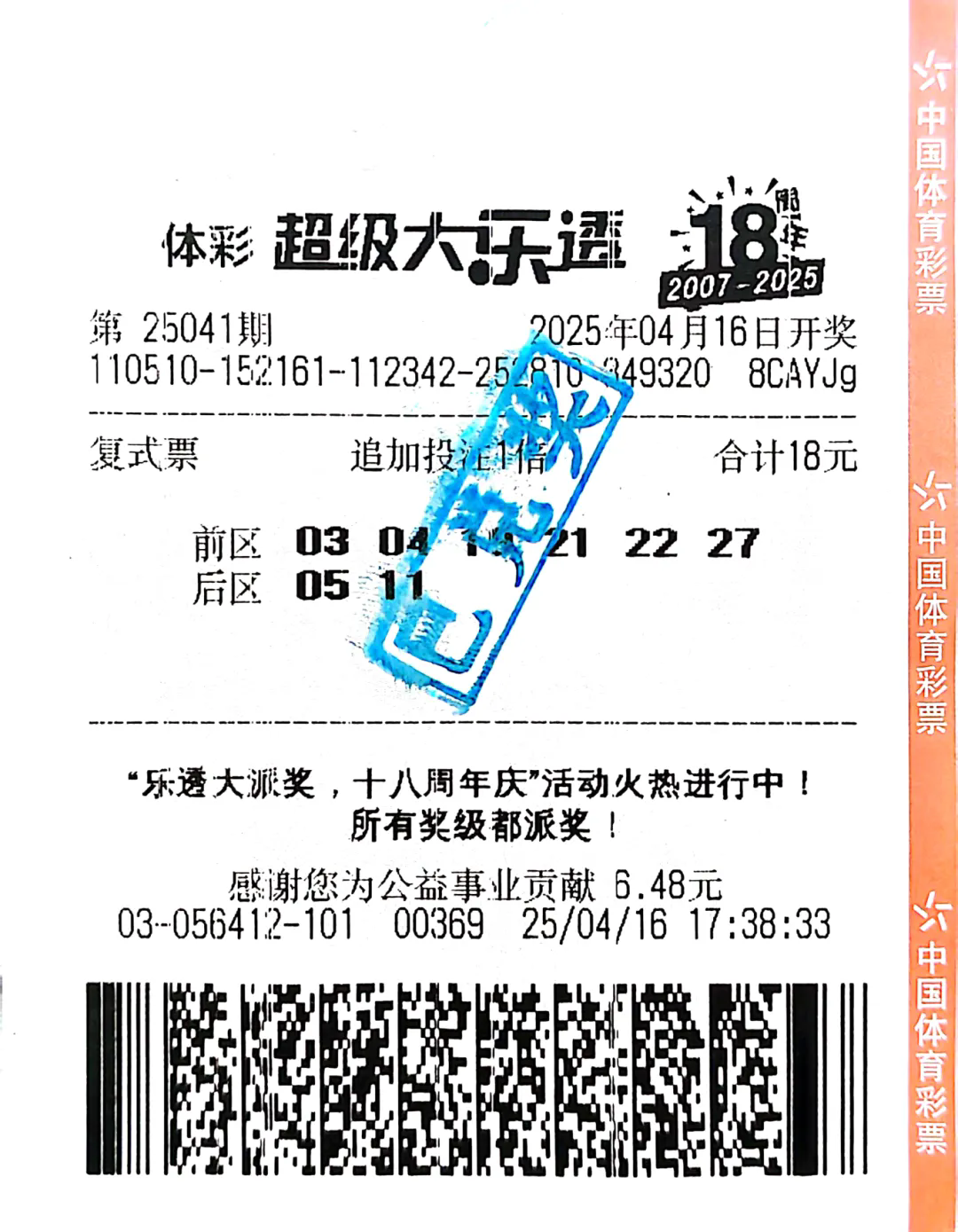 4月16日,大樂透第25041期開獎號碼:03 04 21 22 27+05 11,四川自貢市沿灘新城龍湖美食街36號鋪5103056412體彩銷售點傳來了捷報,一幸運(yùn)購彩者中出1注大樂透一等獎,此次中獎?wù)?025年超級大樂透8.8億大派獎活動期間,這位幸運(yùn)兒在本期總共獲得中獎獎金1670萬,驚喜翻倍!
