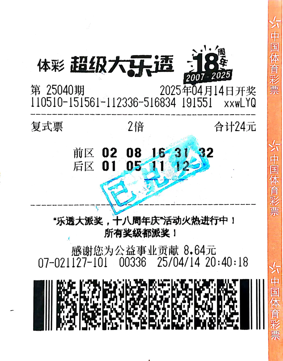同樣值得慶祝的是:4月14日,超級大樂透第25040期開獎,位于綿陽市高新區(qū)飛云東段雅馨花園9-1-5號的5107021127網(wǎng)點也傳來捷報!一位長期支持體彩的資深購彩者,憑借一張單期投注金額24元的“復(fù)式票”成功命中當(dāng)期二、三等獎,加上派獎獎金共收獲83萬元。