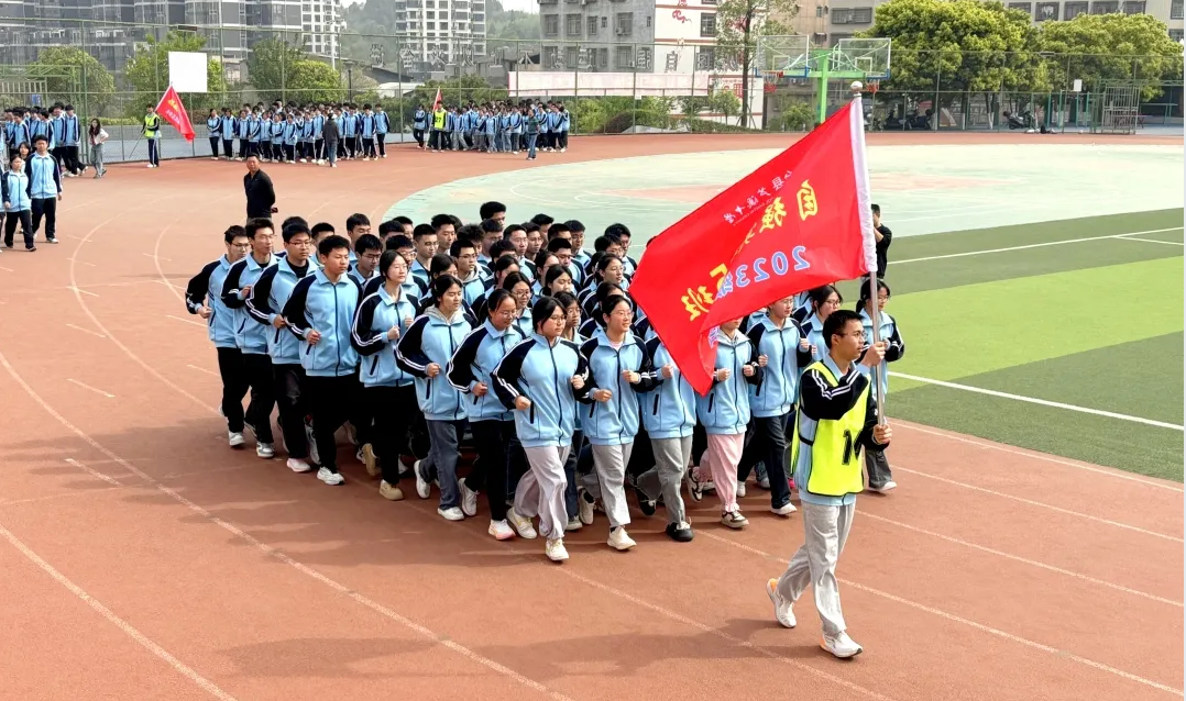 賽場上,各班學(xué)生身著統(tǒng)一跑操服,手持班旗,如雁陣般有序入場。隨著體育組李宗潘老師一聲令下,千名學(xué)子踏著廣播節(jié)奏邁步向前。“曉戰(zhàn)隨金鼓,宵眠抱玉鞍”,李白《塞下曲》中的詩句,映襯著學(xué)子們晨練的汗水與堅(jiān)持。入場時齊整如雁陣掠空,口號聲震若“角聲滿天秋色里”,班旗翻卷似“旗展千重浪,卷含萬壑雷”,就連評委席上的教師也不禁想起王昌齡筆下“前軍夜戰(zhàn)洮河北,已報(bào)生擒吐谷渾”的捷報(bào)酣暢。古人征戰(zhàn)為報(bào)國,今朝奔跑為礪志,雖場景殊異,那份熾熱卻一脈相承。