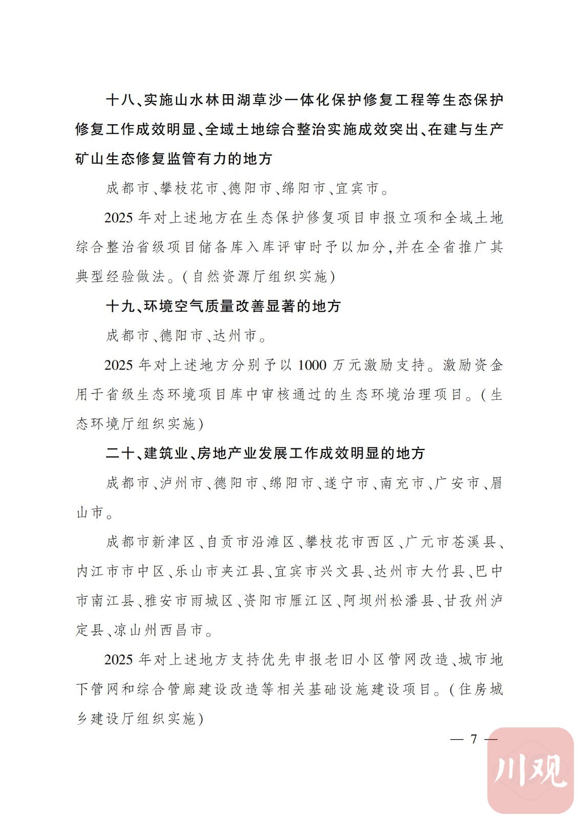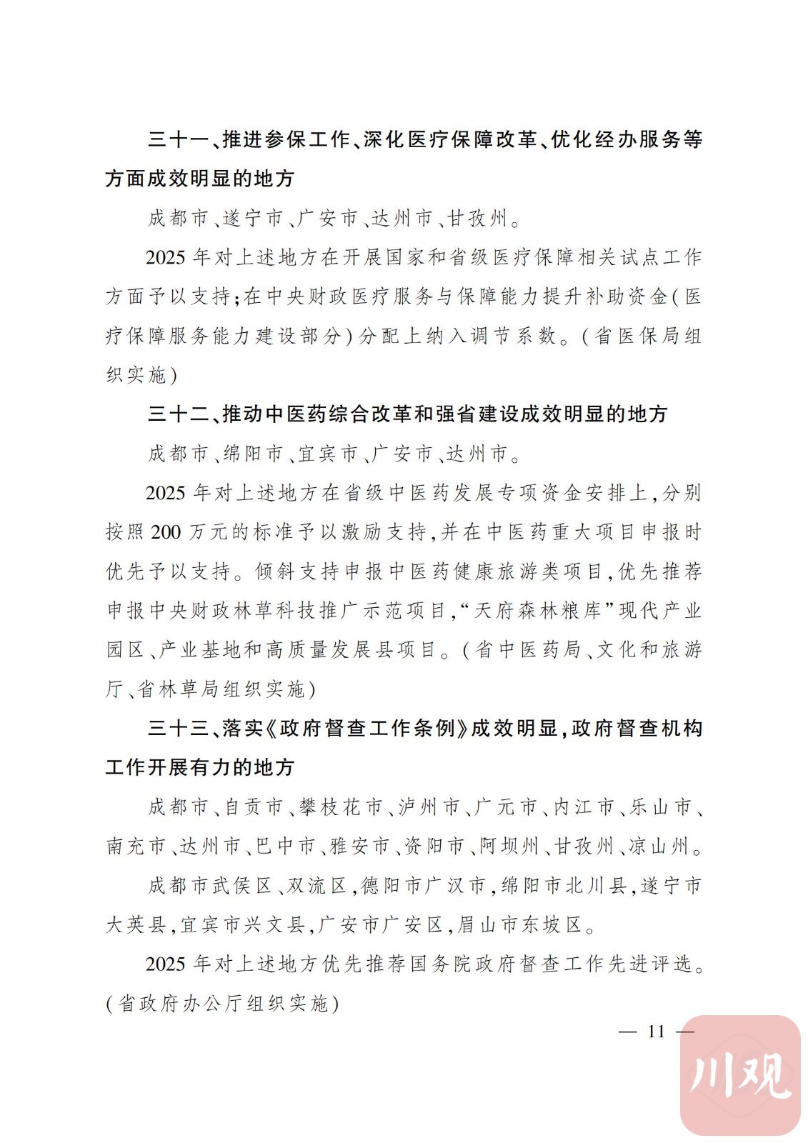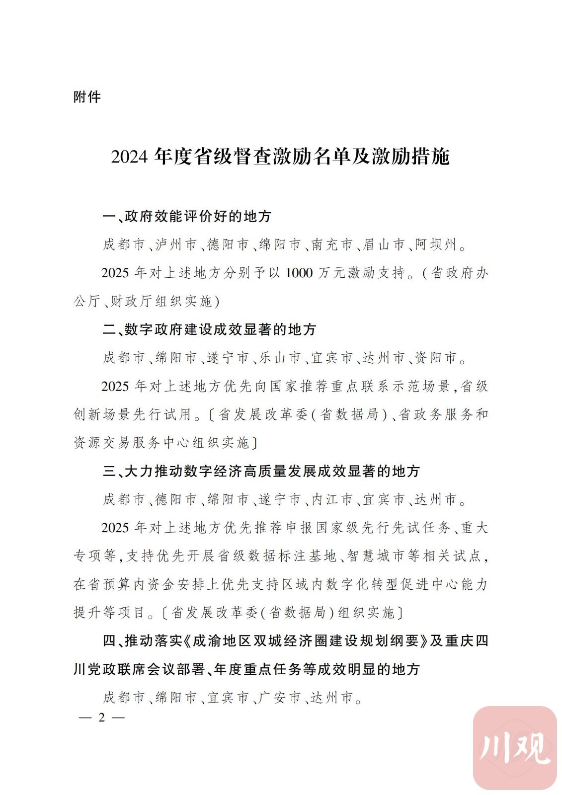 為深入貫徹落實(shí)習(xí)近平總書記來川視察重要指示精神,認(rèn)真落實(shí)省委、省政府決策部署,按照《政府督查工作條例》規(guī)定,經(jīng)省政府同意,決定對(duì)2024年度落實(shí)成渝地區(qū)雙城經(jīng)濟(jì)圈建設(shè)、數(shù)字政府建設(shè)、民營(yíng)經(jīng)濟(jì)發(fā)展、重點(diǎn)產(chǎn)業(yè)鏈發(fā)展等方面有關(guān)重大政策措施真抓實(shí)干、取得明顯成效的21個(gè)市(州)、55個(gè)縣(市、區(qū))予以督查激勵(lì)。