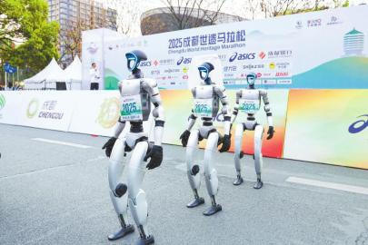 ↑2025成都世遺馬拉松開(kāi)跑前,一場(chǎng)別開(kāi)生面的機(jī)器人表演火熱進(jìn)行。韋洪濤 攝(C視覺(jué))