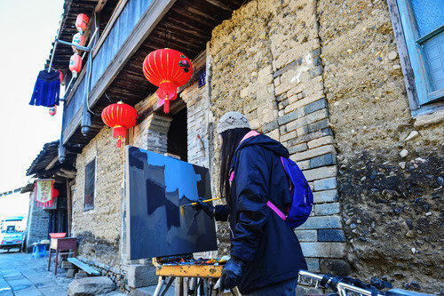 一名旅行畫家在福建省武夷山市五夫鎮(zhèn)的街巷內(nèi)寫生。新華社記者李芒茫攝