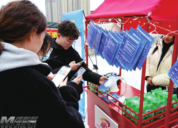 學(xué)生在“星光夜市”的“就業(yè)攤位”前掃描了解可供選擇的崗位