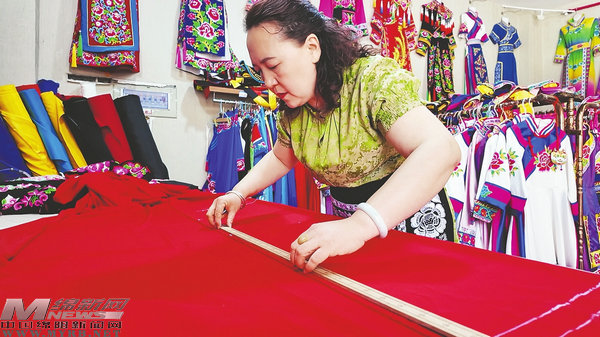 “我們一直在進(jìn)行創(chuàng)新,比如這一款衣服,不管是做工還是走線都非常精細(xì),做出來后大家都比較喜歡,銷量也比較好,這個(gè)花才繡出來,就已經(jīng)訂了幾十套了。”余英一邊向記者介紹,一邊展示店里的服裝。