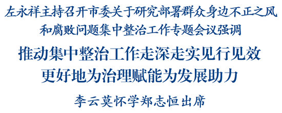 左永祥指出,要壓緊壓實(shí)政治責(zé)任,構(gòu)建齊抓共管的工作格局。市級(jí)領(lǐng)導(dǎo)要主動(dòng)擔(dān)責(zé)、親自研究,各級(jí)黨委要切實(shí)扛起主責(zé),各級(jí)政府要狠抓問(wèn)題治理解決,各職能部門要按照“管業(yè)務(wù)必須強(qiáng)監(jiān)管”要求加強(qiáng)條線工作指導(dǎo),各級(jí)紀(jì)委監(jiān)委既要認(rèn)真履行監(jiān)督專責(zé),又要發(fā)揮牽頭抓總作用,發(fā)動(dòng)各方面力量形成工作合力。要把深化整治與深入貫徹中央八項(xiàng)規(guī)定精神學(xué)習(xí)教育結(jié)合起來(lái),與整治形式主義為基層減負(fù)結(jié)合起來(lái),與市委中心工作結(jié)合起來(lái),切實(shí)把整治成效轉(zhuǎn)化為高質(zhì)量發(fā)展實(shí)效。